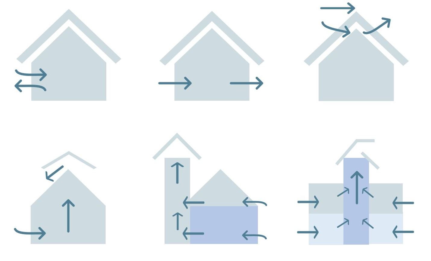 - A combination of inlets via typically controlled window openings and shafts as outlets, creating a stack effect and using pressure difference in different heights.