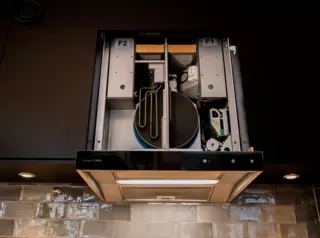 - Blends into the kitchen cabinet with a cabinet door or cover plate