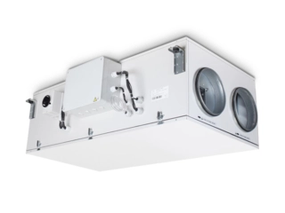 Air handling unit with counterflow plate heat exchanger and side duct connections, with controls.