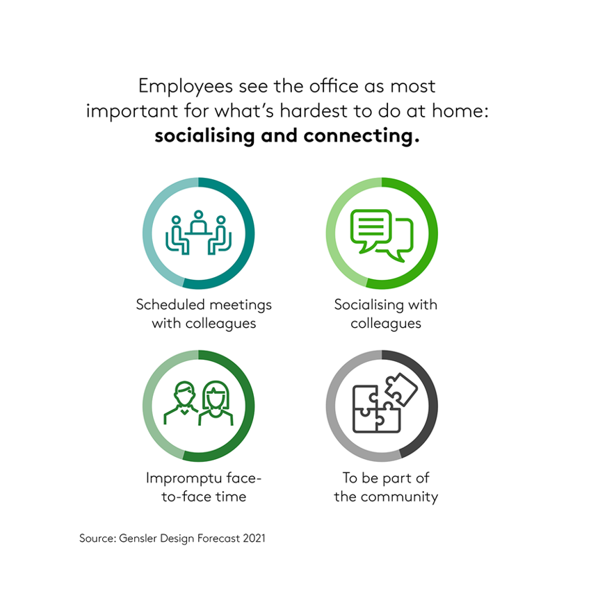 Work and place may be seen as uncoupled and the office is believed to be prioritised if it can offer great human experience and value. Employees expect the office to be a place to reconnect, for personal and professional relationships to thrive and for much more than connectivity. The office is no longer simply task focused.